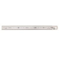 Single sided stainless steel rule with graduations on both upper and lower edges with numerical markings in centre only One square end and one round end with hanging hole Length: 300mm Width: 30mm Made in Japan
