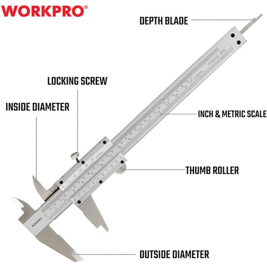 WORKPRO 150MM Vernier Caliper delivers precision measurement in a compact, professional-grade instrument. Constructed from durable stainless steel, it resists corrosion and maintains accuracy across diverse workshop and site environments. The vernier scale enables precise readings to fractional increments, essential for machining, fabrication, and quality control applications. Smooth sliding mechanism and secure locking ensure repeatable measurements without drift. Suitable for engineers, machinists, and tradespeople requiring dependable dimensional verification of components, materials, and assemblies. An indispensable tool for exacting work where accuracy directly impacts final product quality.