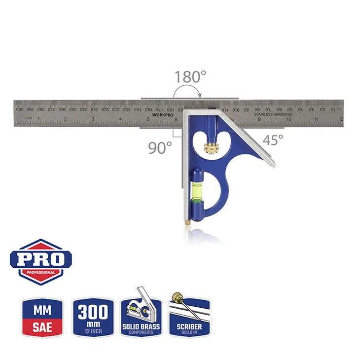 WORKPRO Combination Square delivers versatile precision for layout and measurement tasks. The precision-machined die-cast aluminum stock provides durability and dimensional stability across varied applications. Features a removable brass scriber for accurate marking and an impact-resistant acrylic vial for level verification. The etched stainless steel blade resists corrosion and wear, maintaining crisp graduations throughout its service life. Comprehensive graduation markings in 1/8", 1/16", 1/32" and metric (mm) scales accommodate diverse measurement requirements. An indispensable tool for tradespeople, fabricators, and construction professionals requiring reliable accuracy and multi-function capability on site.