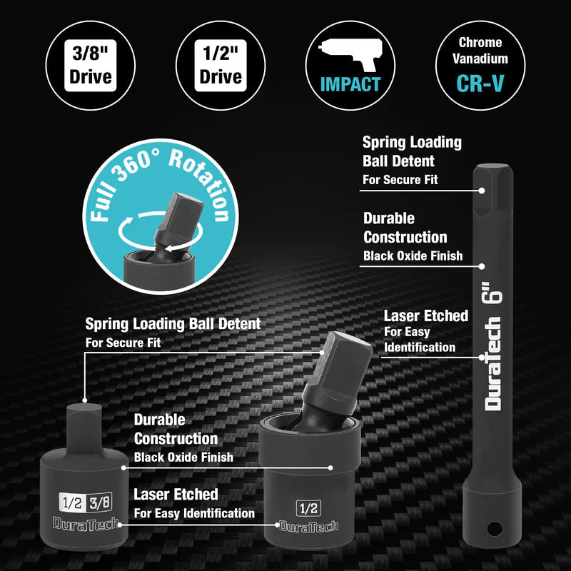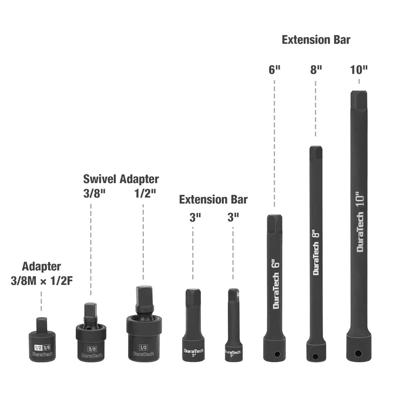 intended for using with an impact tool to provide maximum installation of heavy duty fasteners. Extension bars for reaching deep screw hole. Whether you’re working with 1/2" Dr or 3/8" Dr measurements, these pieces will meet your needs and they are easy identified, ensuring you find the exact tool you need