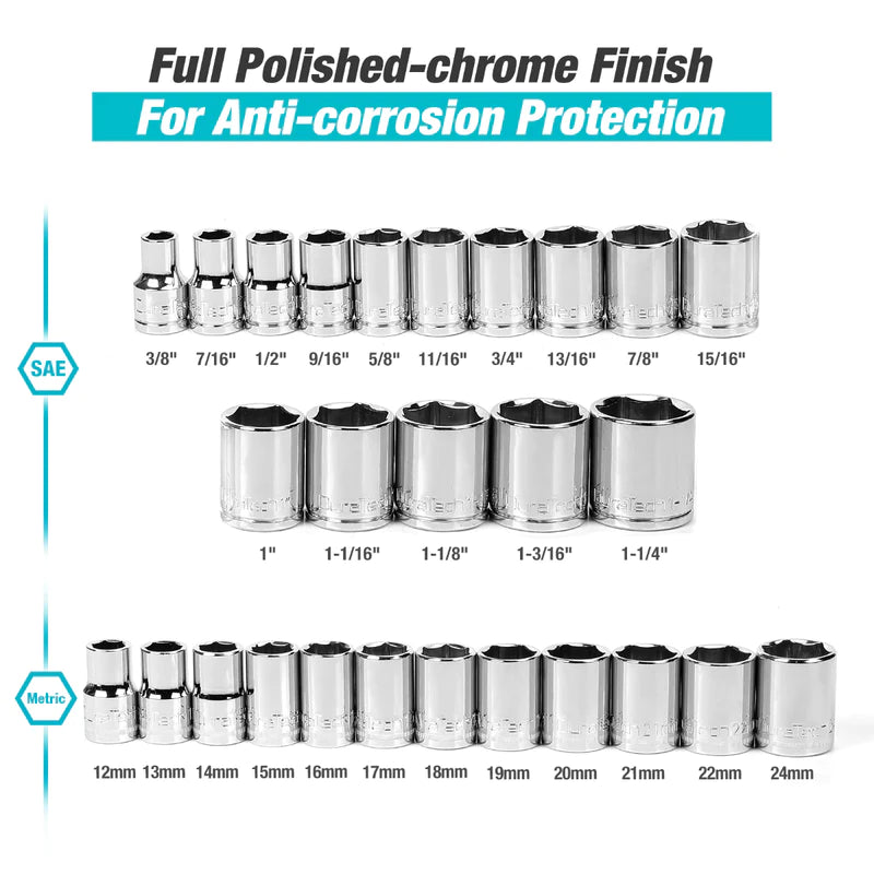 Includes:The 27 most commonly used sizes in both SAE(3/8”- 1-1/4”) and metric(12mm-14mm), 3 PC Extension bars(3"/5"/10"), 1 PC Universal joint, 1 PC Breaker bar( 11-4/5”)