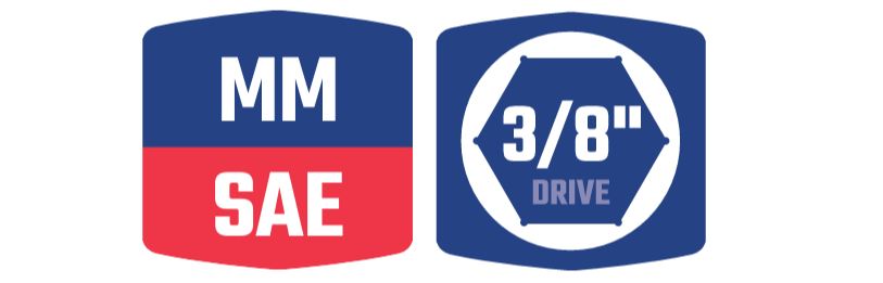 • 3/8 Drive: 10PC 6pt SAE socket: 1/4”, 5/16”, 3/8”, 7/16”, 1/2”, 9/16”, 5/8”, 11/16”, 3/4”, 13/16”