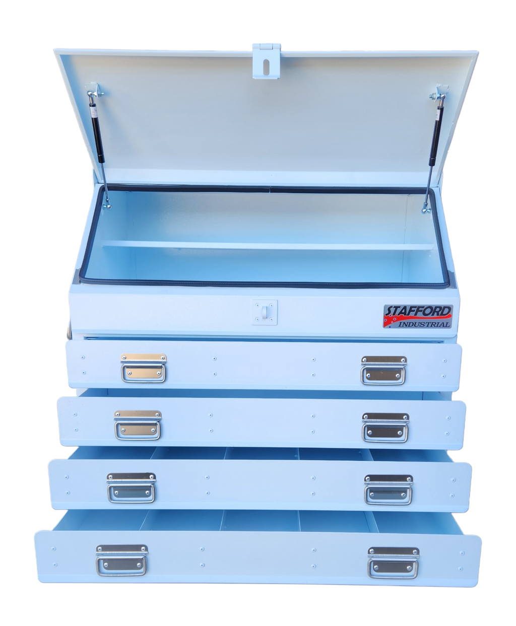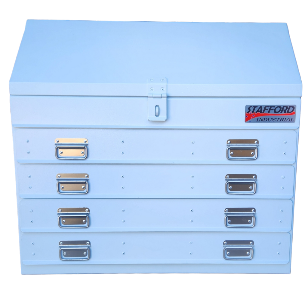 The Stafford Four Drawer Angled Truck Tool Box is a heavy duty gauge steel fabricated tool box. Water proof and lockable, this tool box is made to combat the harsh environments of living on the back of your truck. With 1.5mm thick walls, four drawers, gas struts and a powder coated finish this large storage space is the tradesman’s best mate.