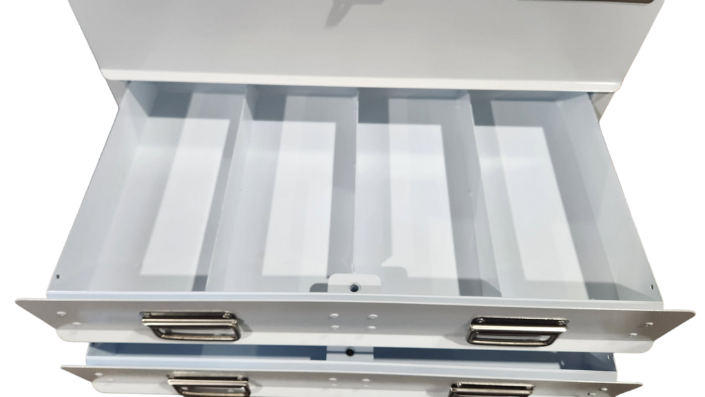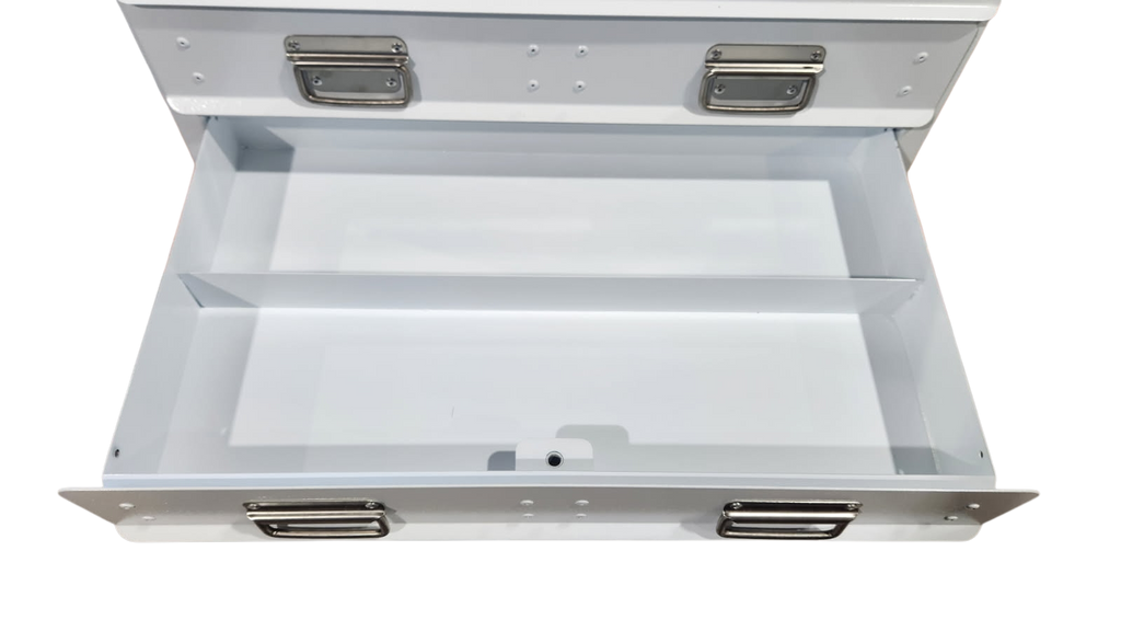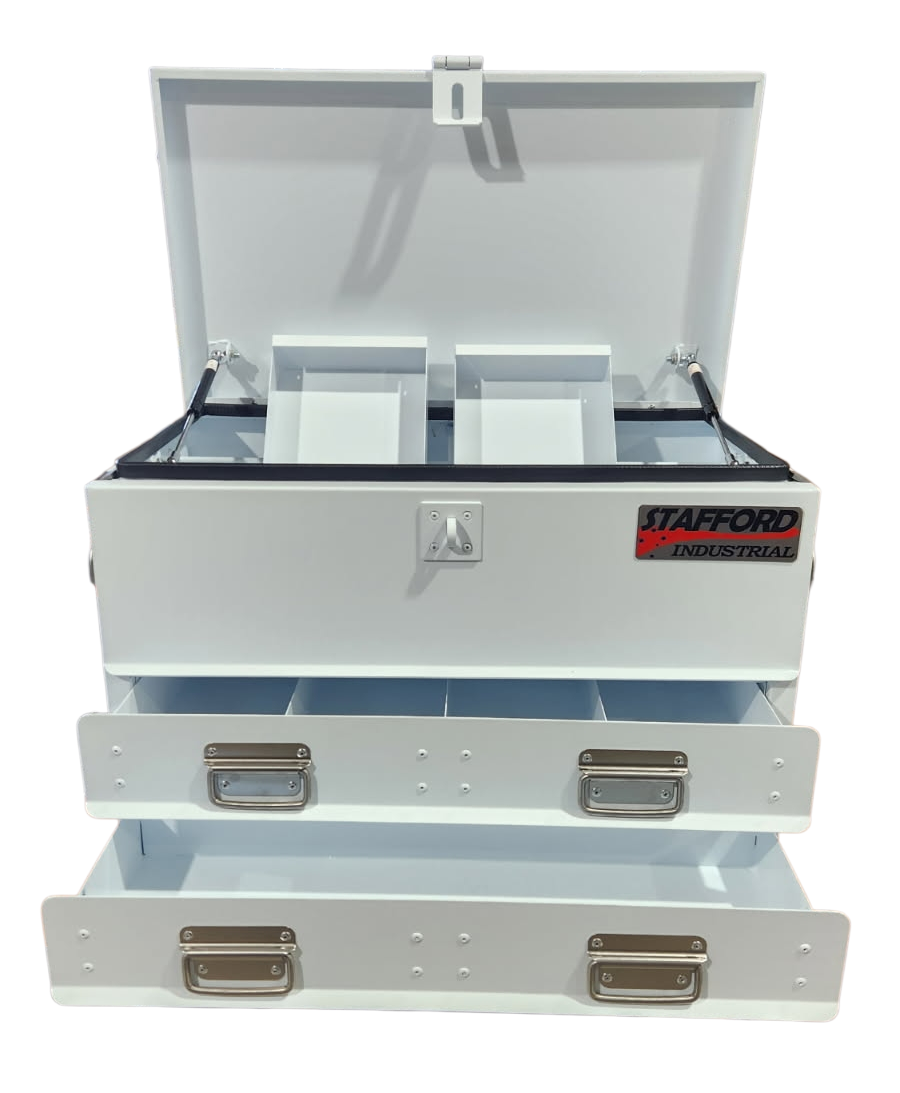 The Stafford Two Drawer Ute Box is a heavy duty gauge steel fabricated tool box. Water proof and lockable, this tool box is made to combat the harsh environments of living on the back of your Ute. With 1.5mm thick walls, two drawers, two lift out top trays, gas struts and a powder coated finish this large storage space is the tradesman’s best mate.